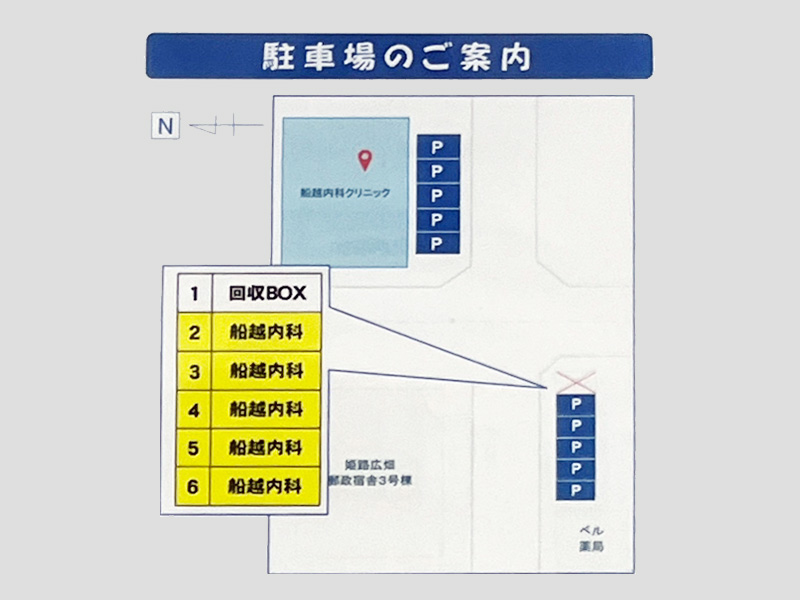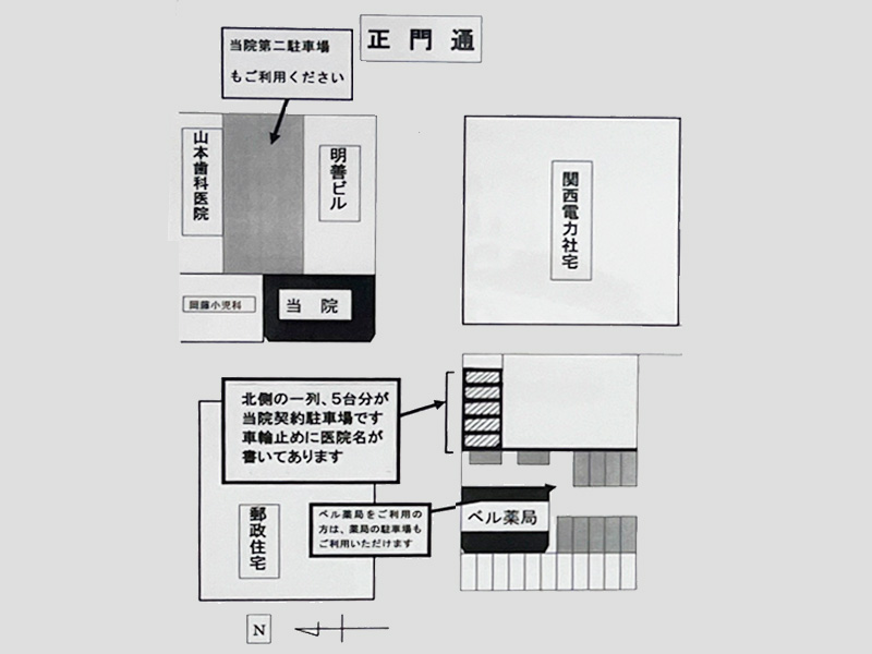 当院の駐車場はP部分のみとなります。それ以外への駐車は近隣住民の方へのご迷惑となりますのでご遠慮ください。